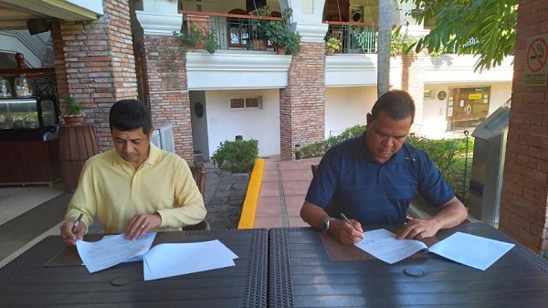 Photo shows Val Hilario and Mel Dulay signing the MOA at a simple ceremony held at the Orchard Golf and Country Club on March 11, 2021.